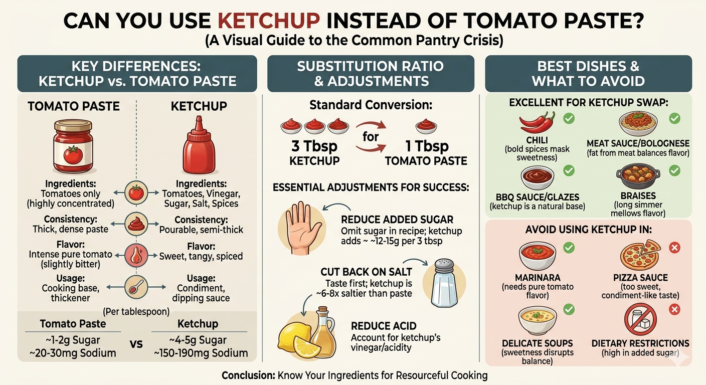 این راهنما دقیقاً زمان و نحوه استفاده را به شما نشان می دهد سس کچاپ instead of tomato paste ، نسبت تبدیل مناسب، چه تنظیماتی را باید انجام دهید، کدام ظروف تعویض را بهتر تحمل می کنند و کدام ها را ندارند — بنابراین می توانید با اطمینان حتی بدون لوازم اصلی انبارداری خود آشپزی کنید.